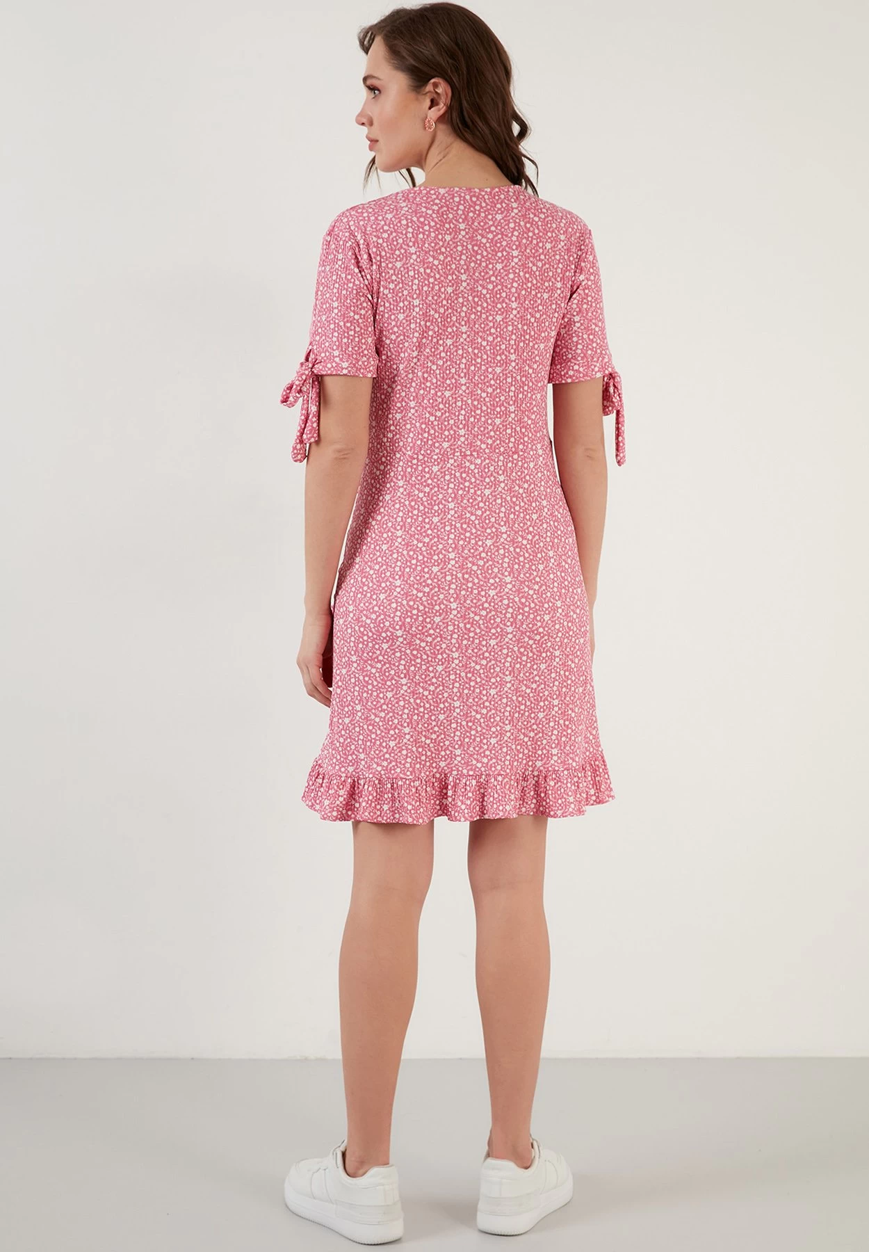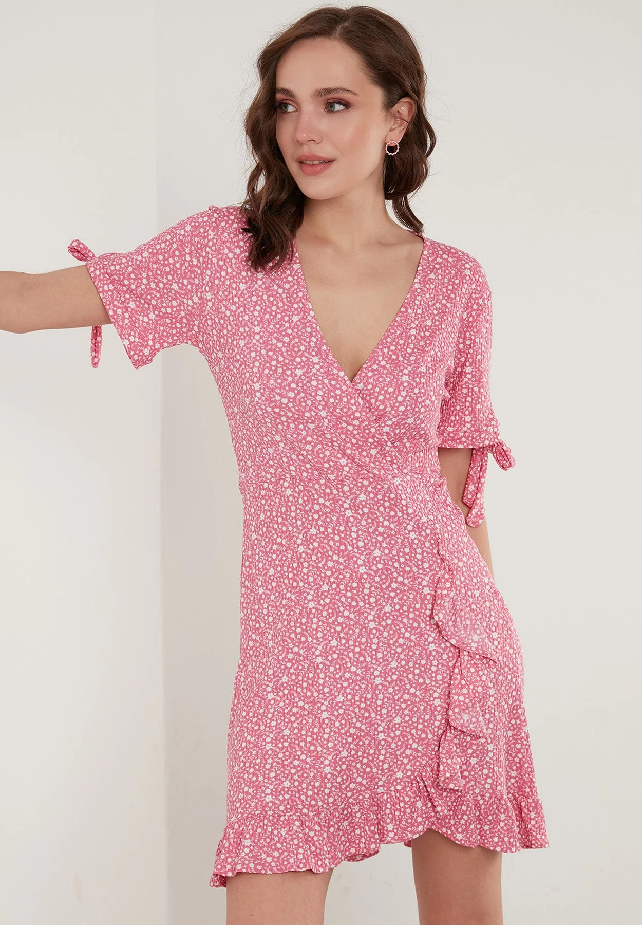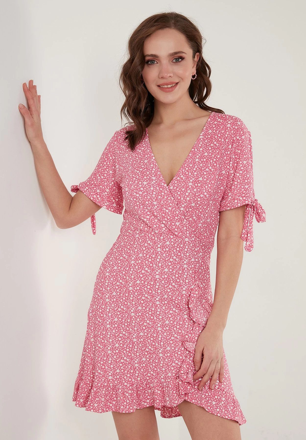 LELA Floral V Neck Ruffle Detail Mini- Jurk – Fuchsia