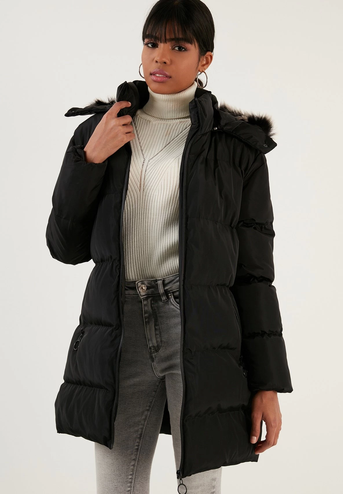 | Details capuchon | Gevoerd, afneembare imitatiebontkraag |