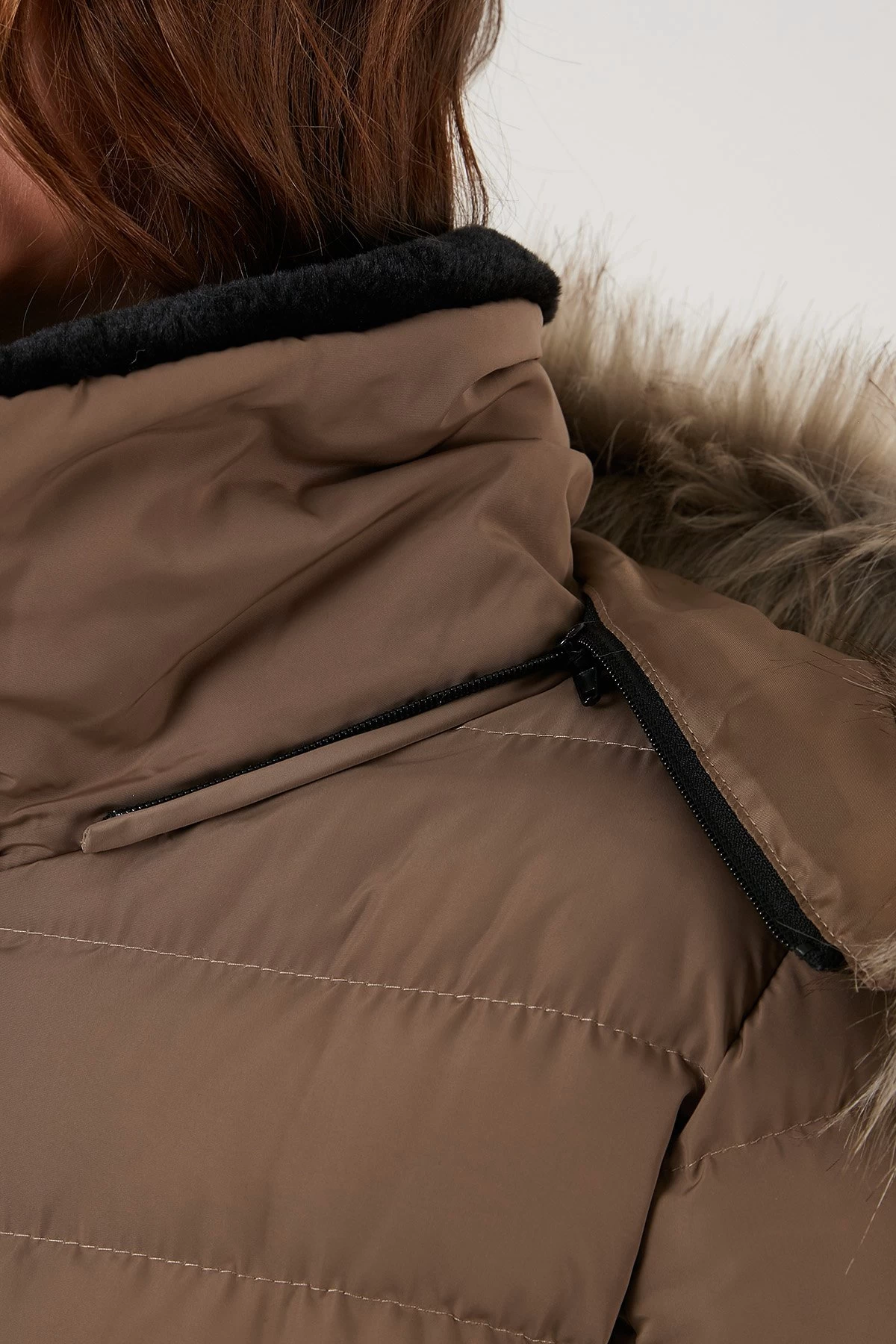 | Details capuchon | Afneembare imitatiebontkraag |