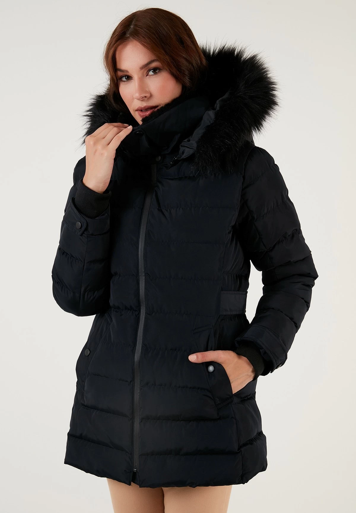 | Details capuchon | Afneembare imitatiebontkraag |