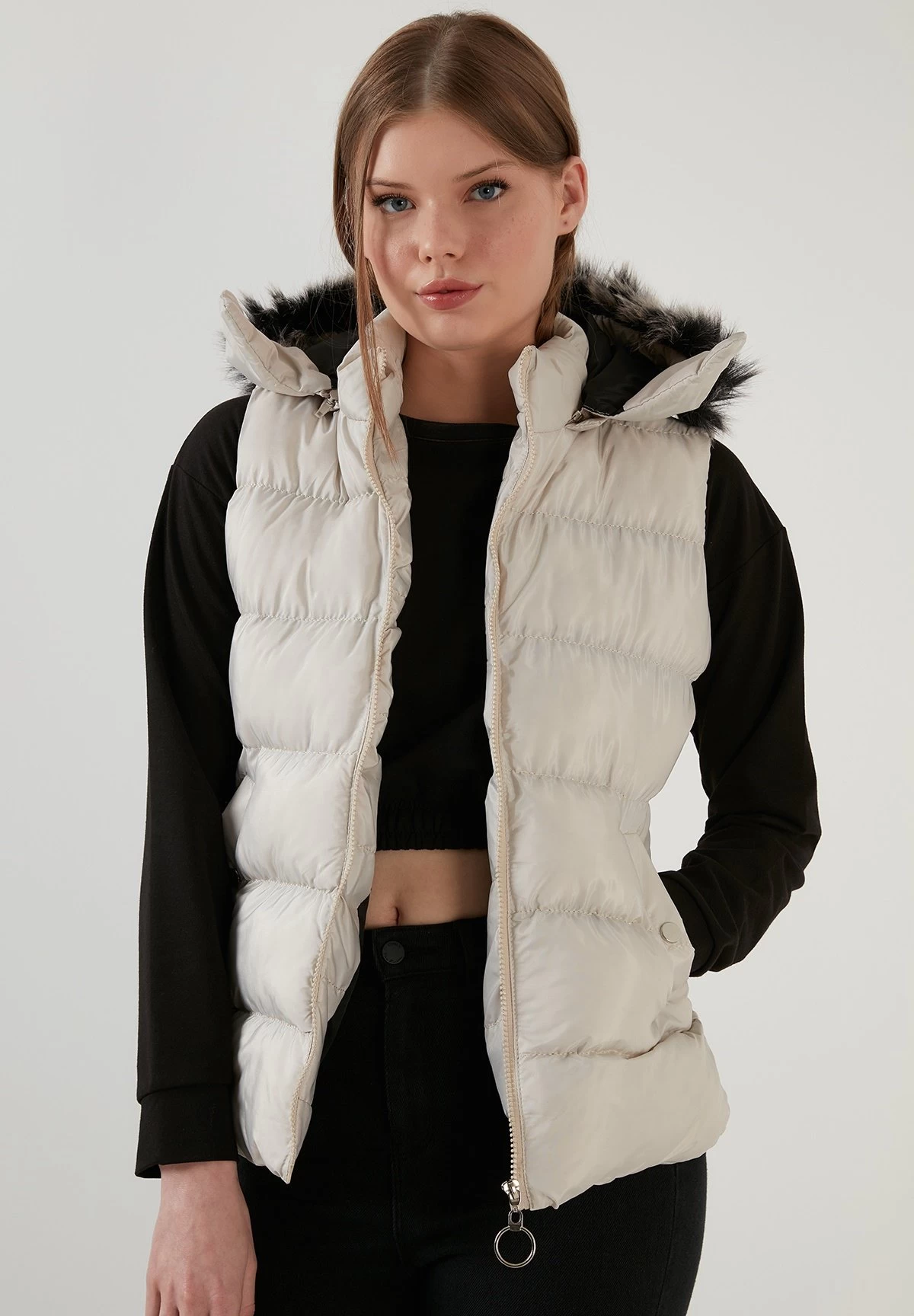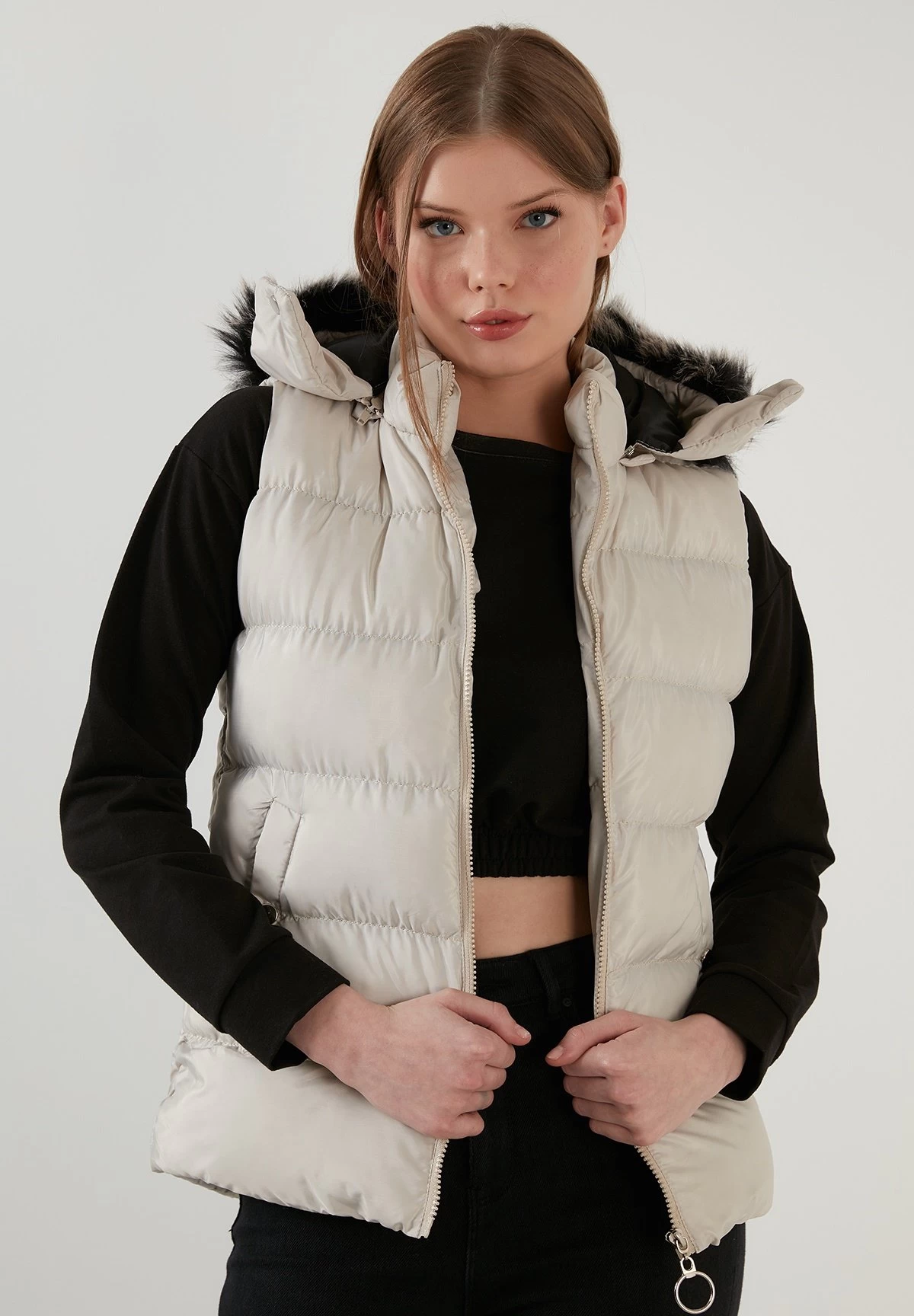 | Details capuchon | Gevoerd, afneembare imitatiebontkraag |