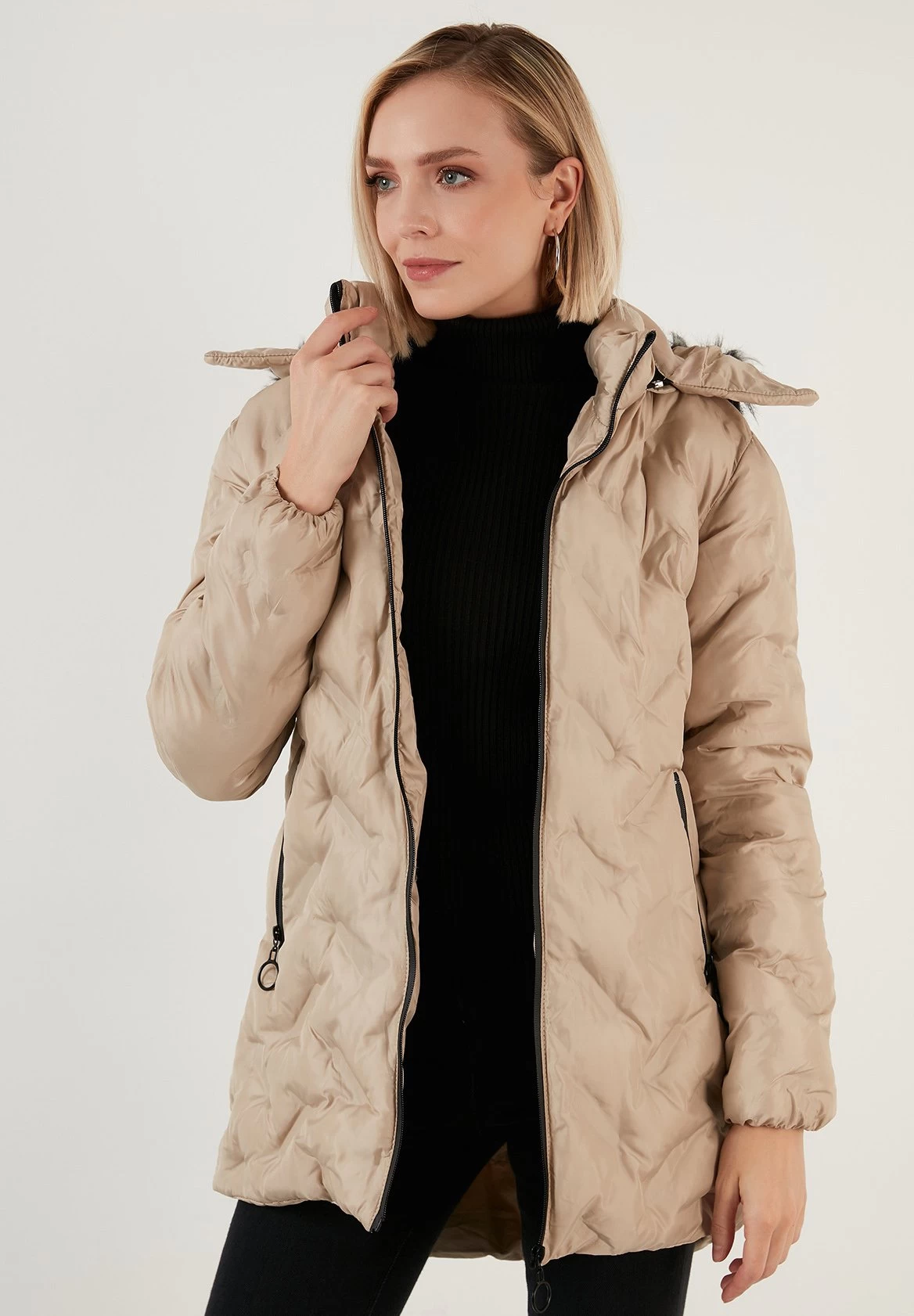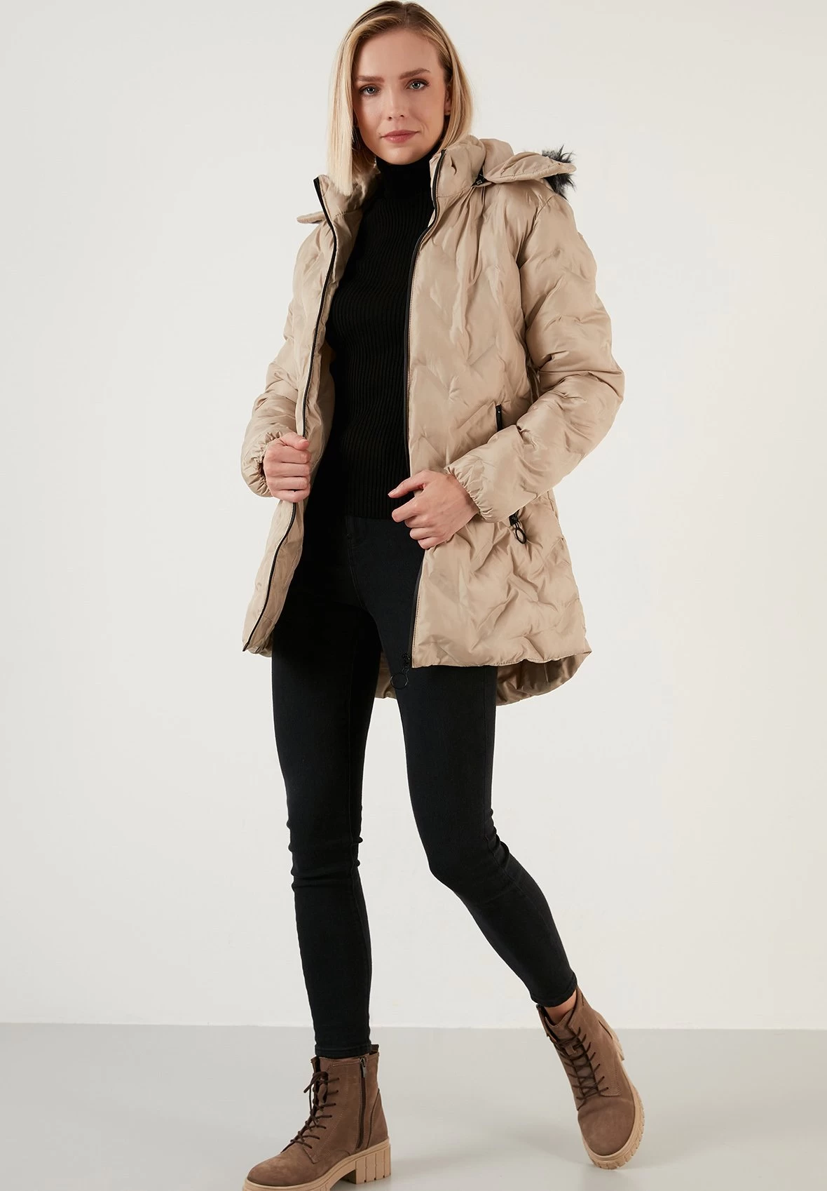 | Details capuchon | Gevoerd, afneembare imitatiebontkraag |